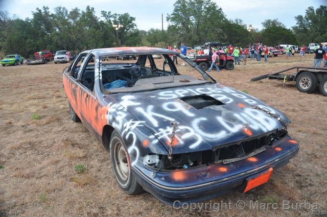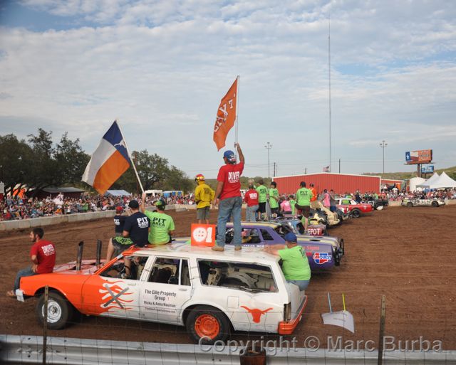 The rural land near the volunteer fire department headquarters was charred from wildfires that roared earlier in September 2011, destroying dozens of buildings. This evening was the communitys way of showing its support to its firefighters by showing up for the annual destruction derby. The derby is a main fundraiser for the department, and folks came in by the thousands to contribute to the cause while having a good time. Local firefighters and Texas Forest Service personnel received standing ovations for their work to save lives and property.