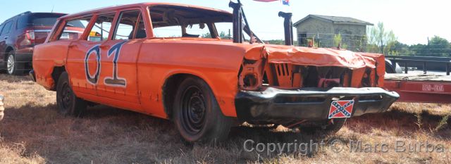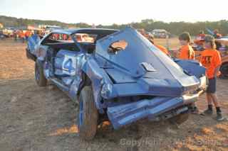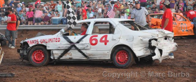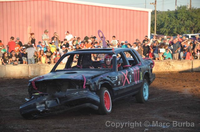 Toward the end of the marathon 9-car compact heat, the audience choices for best-looking cars a tie between a My Little Pony Chevy Cavalier driven by Stephanie Conner and a Zombie Outbreak Response Team vehicle driven by L.D. Rossesetter that originally came complete with a water-gun turret had been knocked out. It came down to Collin Chalmers in a basic black 1993 Toyota Corolla, Cody Williamson in a basic black 1995 Geo Prizm (a U.S. version of a Toyota model) that he only had for five days, and Wendell Ubernosky in a basic white Toyota Camry. After Collins car died, Wendell and Cody continued to pummel each other until Codys car could no longer move, and he was forced to break his flag. By that time, the old Geos trunk compartment had compacted into the interior, and the drivers seat back had broken. Wendells Camry was running on a rim.